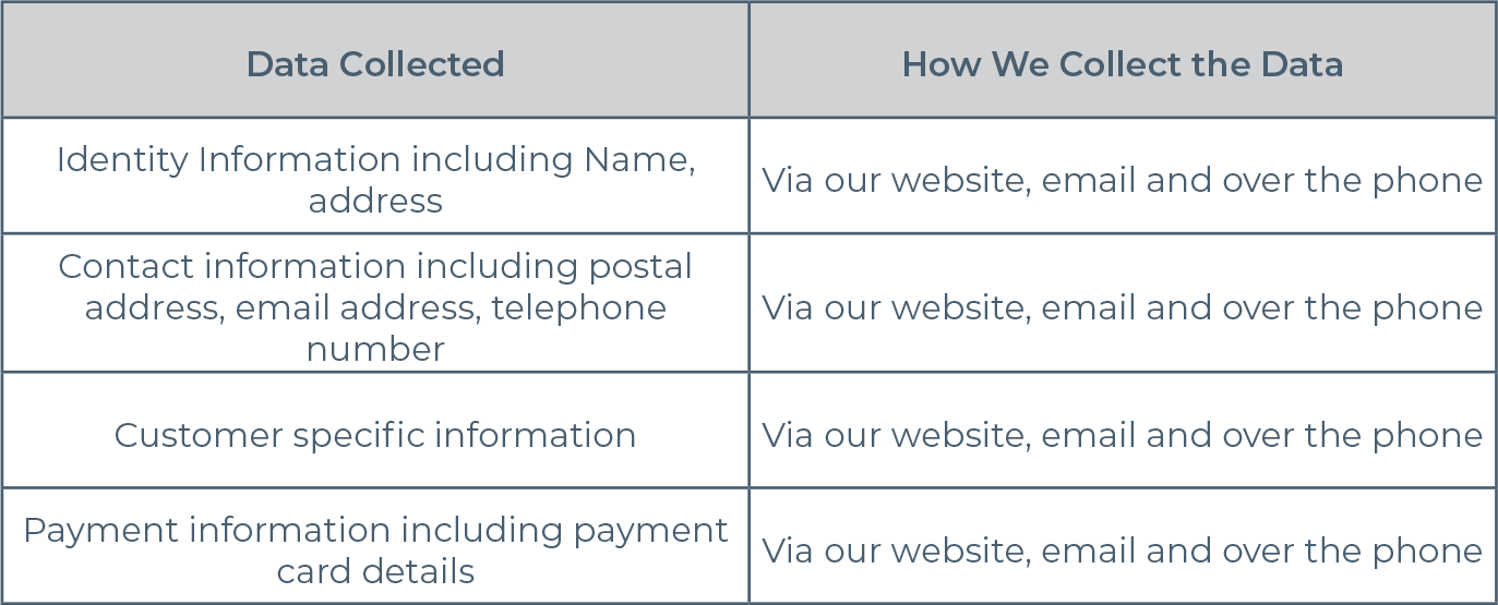 Depending upon your use of our Site, We may collect and hold some or all of the personal data set out in the table below, using the methods also set out in the table.